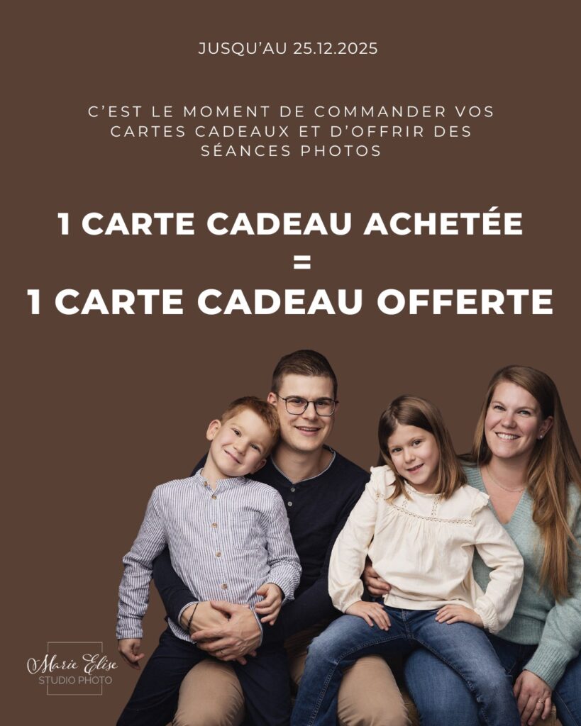 Tout le mois de novembre et jusqu’au 25 décembre, profitez d’une offre exceptionnelle sur notre Séance Découverte : un shooting en studio avec 1 portrait retouché, un tirage premium 20×25 cm et le fichier HD correspondant… et une deuxième carte cadeau offerte pour gâter quelqu’un que vous aimez.